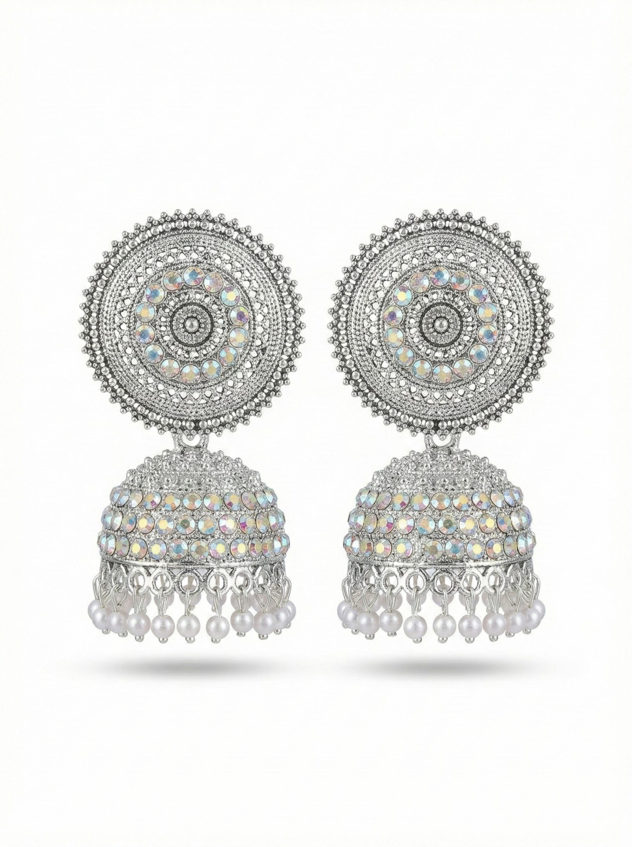 Step into the spotlight with these exquisite Oxidized Silver Jhumkas, designed to blend timeless tradition with a modern, shimmering twist. The centerpiece features a masterfully crafted mandala-style stud, leading down to a classic dome jhumka adorned with multicolor iridescent stones that catch the light from every angle. Finished with a fringe of delicate pearl drops, these earrings are the ultimate statement of elegance.