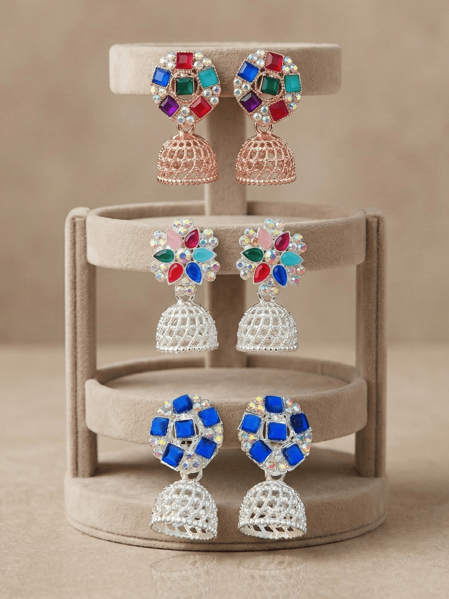 Enhance your ethnic style with the Reet Rhythm Multicolor Designer Jhumka Earrings Set, a beautiful collection of three vibrant jhumka earrings designed for weddings, festivals, and special occasions.