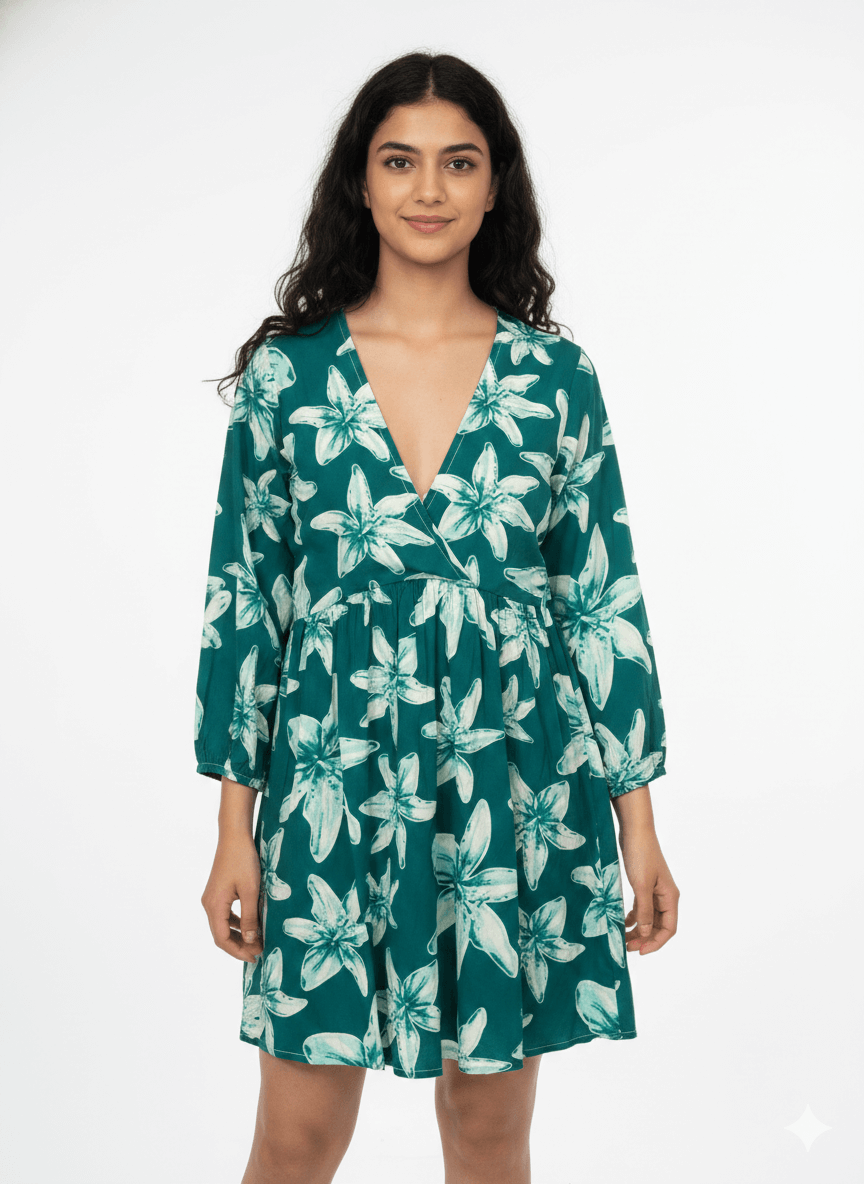 Discover the perfect blend of comfort and high fashion with our Deep Green Floral Mini Dress. Designed for the modern woman, this piece features a striking white floral motif that pops against a rich emerald background. The carefully tailored V-neck and flared hemline create a timeless silhouette that flatters every figure.